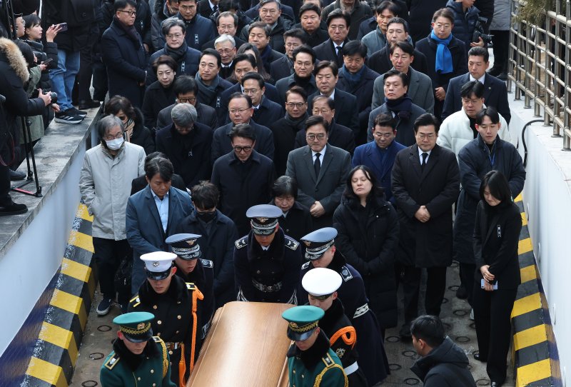상임장례위원장인 김 총리와 정 대표, 한병도 민주당 원내대표를 비롯한 이재명 정부와 민주당 소속 여권 인사들이 고인을 영접했다.