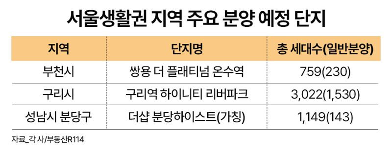 DL이앤씨·GS건설·SK에코플랜트 컨소시엄은 같은 달 구리시 수택동 일원에 ‘구리역 하이니티 리버파크’를 분양할 예정이다. 단지는 지하 6층~지상 최고 35층, 26개 동(아파트 24개 동·주상복합 2개 동), 총 3022가구 규모로 조성된다. 포스코이앤씨는 경기도 성남시 분당구 정자동 느티마을 4단지 리모델링 사업을 통해 ‘더샵 분당 하이스트’를 분양할 예정이다. 단지는 전용면적 66~84㎡, 총 1149가구 규모로 조성되며 이 중 143가구가 일반분양 물량이다. 수인분당선과 신분당선 환승역인 정자역을 도보로 이동할 수 있다.