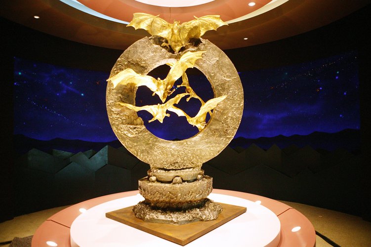 가로 1.5m, 높이 2.1m 규모 은으로 된 원형 조형물에 순금으로 만든 6마리의 황금박쥐가 날개를 펼치고 날아오르는 모습을 형상화한 황금박쥐상은 제작 당시 재료비로만 약 27억원이 투입됐다.