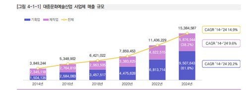 (서울=연합뉴스) 김정선 선임기자 = 국내 대중문화예술산업의 매출 규모가 15조원을 넘어섰다고 한다. 이는 기획업체 증가, 주요 기획사의 성장, 대중문화예술인들의 해외 활동 등이 맞물린 결과로 풀이된다. 대중문화예술은 다른 분야로의 파급 효과가 있어 사람들의 관심도가 높은 분야 중 하나라고 할 수 있다.