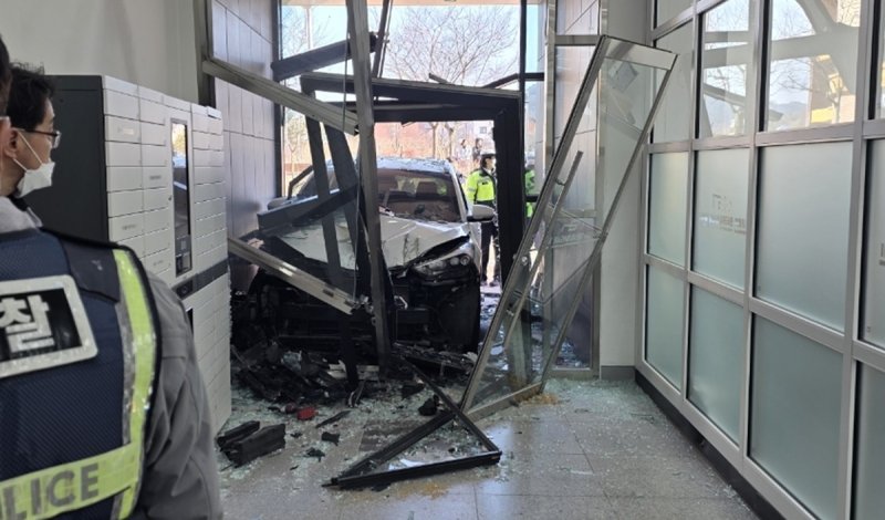 (김천=연합뉴스) 김현태 기자 = 27일 낮 12시 57분께 경북 김천시 율곡동에서 스포츠유틸리티차(SUV)가 도서관 건물 1층으로 돌진하는 사고가 발생했다.