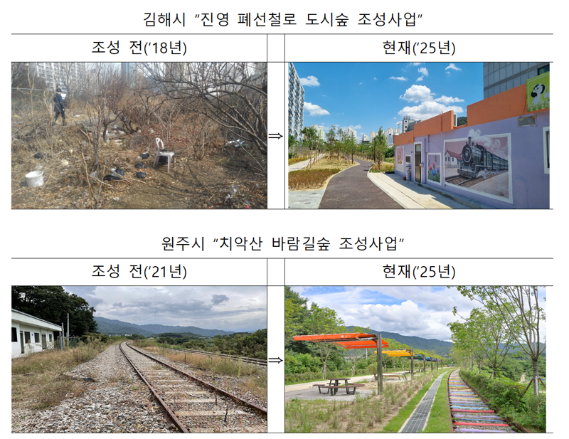 공단은 지난 2015년부터 매년 공모를 시행해 현재까지 49개 지자체에서 81개 사업이 추진 중이다. 대표적으로 김해시 '진영 폐선철로 도시숲 조성사업', 원주시 '치악산 바람길숲 조성사업'은 2025년 산림청 녹색도시 최우수 및 우수사례로 선정된 바 있다.