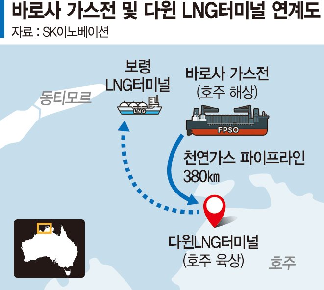 SK이노베이션 E&S는 27일 호주 바로사 가스전에서 생산된 천연가스가 다윈 LNG터미널로 운송돼 첫 LNG 카고 선적까지 완료했다고 밝혔다. 바로사 가스전은 호주 북서부 해안에서 약 300 ㎞ 떨어진 해상에 위치한 가스전이다. SK이노베이션 E&S(지분 37.5%)는 호주 산토스(지분 50%), 일본 제라(지분 12.5%)와 함께 이번 프로젝트의 핵심 파트너 역할을 수행하며 가스전 매장량 평가, 인허가, 해상 및 육상 설비 건설 등에 총 16억 달러(약 2조원)를 투자했다.