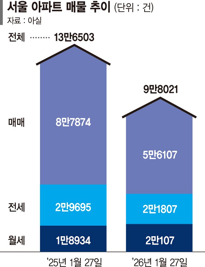 27일 부동산업계에 따르면 서울 아파트 전체 매물은 1년 새 13만6000건대에서 9만8000건대로 약 4만건 감소했다. 빅데이터 플랫폼 '아실'에서 확인한 결과 지난해 1월 27일 기준 8만7874건이던 매매 매물은 이날 5만6107건으로 36%가량 줄었다. 전세 매물도 같은 기간 2만9695건에서 2만1807건으로 약 27% 감소했다.