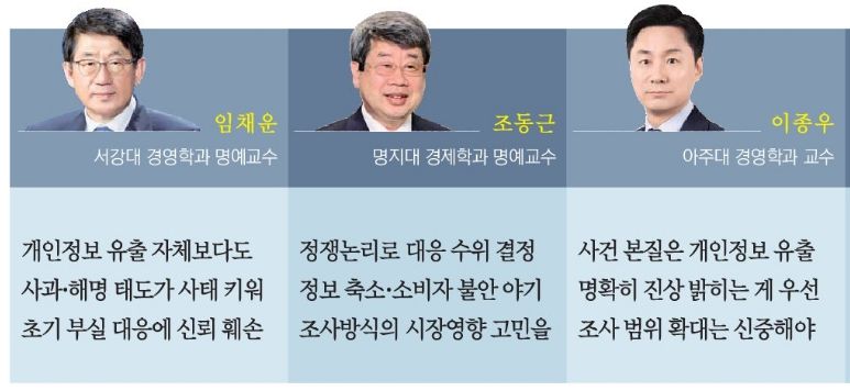 임채운 서강대 경영학과 명예교수는 "개인정보 유출 자체보다도 사과와 해명 과정에서 드러난 대응 태도가 사태를 키웠다"며 "그동안 영향력에 의존해 봉합돼 왔던 문제들이 이번 일을 계기로 동시에 표면화된 것으로 보인다"고 분석했다. 이어 "개인정보 유출 그 자체보다도 사과와 해명 과정에서 드러난 대응 태도가 신뢰를 더 크게 훼손한 측면이 있다"며 "이를 단순한 괘씸죄로 해석하기보다는, 기존에 누적돼 있던 문제들이 동시에 조사 대상이 된 결과로 보는 게 더 정확하다"고 짚었다.