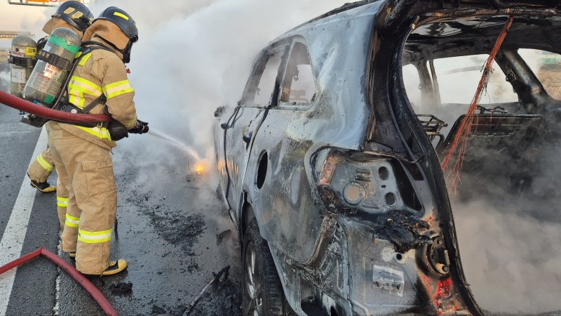 27일 오후 5시 24분께 전북 김제시 공덕면 한 도로에서 주행 중이던 SUV에서 불이 났다.(전북소방본부 제공. 재판매 및 DB금지) ⓒ News1 문채연 기자