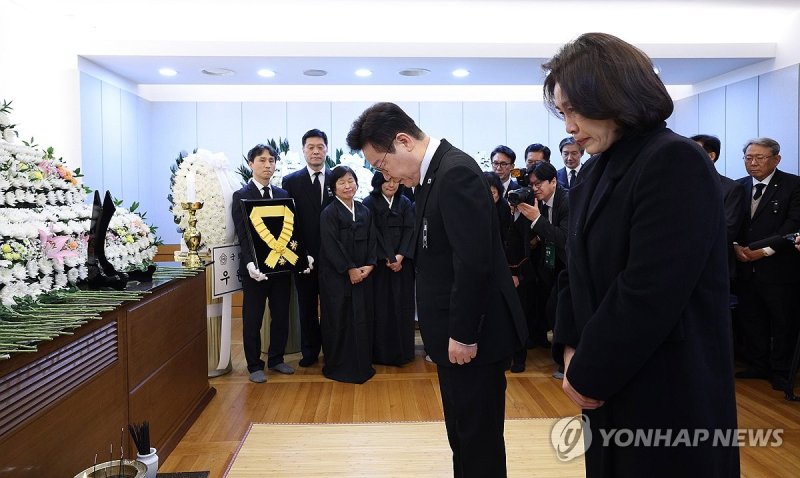 이 대통령과 김혜경 여사는 이날 오후 검은색 복장 차림으로 조문했다. 이 대통령은 김 여사와 함께 영정 앞에 헌화한 뒤 무릎을 꿇고 분향했다.