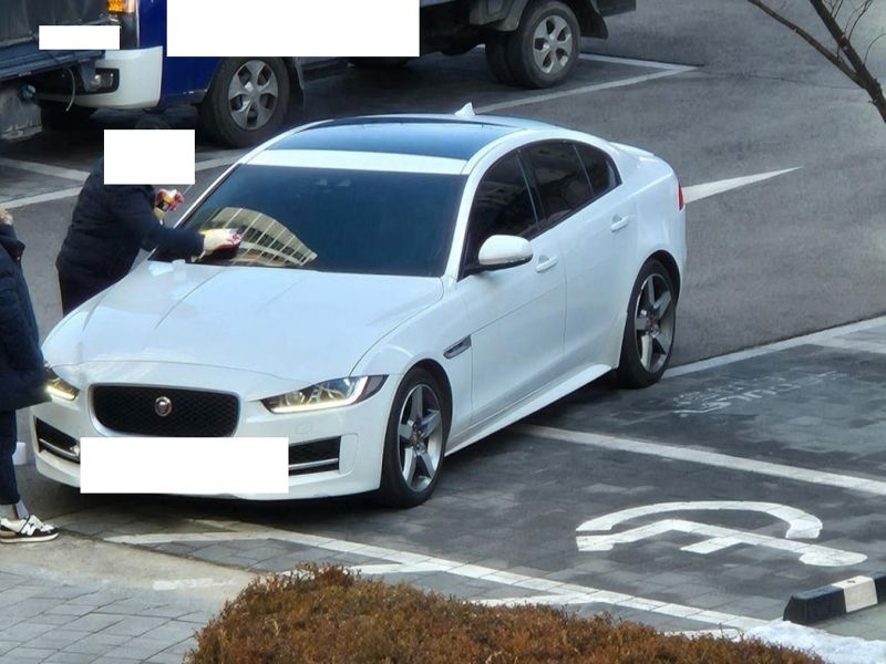 A씨 함께 공개한 사진을 보면 경비원이 목장갑을 끼고 재규어 차량에 부착된 스티커를 떼고 있는 모습이 담겼다.