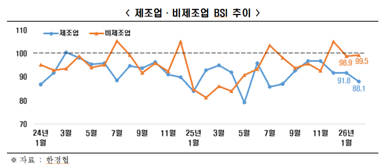 이번 조사에서 제조업 BSI는 88.1로 전월(91.8) 대비 3.7포인트 하락해 80선으로 내려앉았다. 비제조업은 99.5로 소폭 반등했지만 여전히 기준선을 밑돌았다. 제조업은 2024년 4월부터 1년 11개월 연속, 비제조업은 올해 1월부터 2개월 연속 기준선 100을 하회하고 있다.