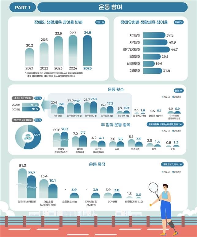 조사에 따르면, 주 2회 이상 1회당 30분 이상 집 밖에서 운동한 장애인 생활체육 참여율은 2024년 35.2%에서 0.4%포인트 감소했다.