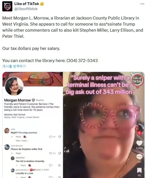 26일(현지시간) 폭스뉴스에 따르면 웨스트버지니아주 잭슨 카운티 보안관실은 리플리 출신 모건 모로우(잭슨 카운티 공공도서관 사서)가 트럼프 대통령 암살을 위한 인물 모집 영상을 올려 테러 위협 혐의로 기소됐다고 전날 밝혔다.
