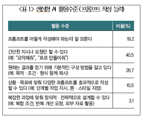 보고서는 생성형 AI의 생산성 효과가 단순한 사용 시간 확대가 아니라 활용 역량에 의해 결정된다고 강조했다. 프롬프트 작성 능력을 기준으로 분석한 결과 상황과 목적에 맞춰 AI를 능숙하게 활용하는 '고도 활용자'는 전체의 13.6%에 불과했다.