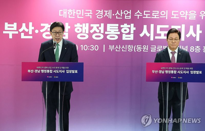 박 시장과 박 지사는 "행정통합은 지방선거 전략이나 형식적 통합이 아니라 지역이 주도하는 균형발전의 출발점이 돼야 한다"며 "정부가 권한을 과감히 내려놓고 통합 자치단체의 재정·자치 분권을 결단할 때 부산·경남 행정통합의 시기는 앞당겨질 수 있다"고 강조했다.