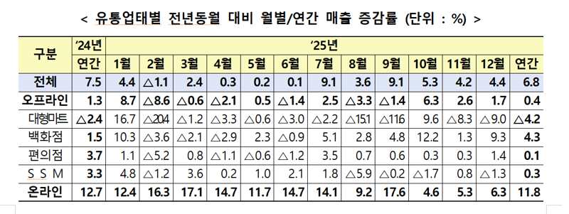 백화점(4.3%)과 편의점(0.1%)은 상반기 성장세가 다소 주춤했으나, 하반기 소비심리 회복에 힘입어 7월부터 6개월 연속 성장하며 연간 플러스 성장을 기록했다.