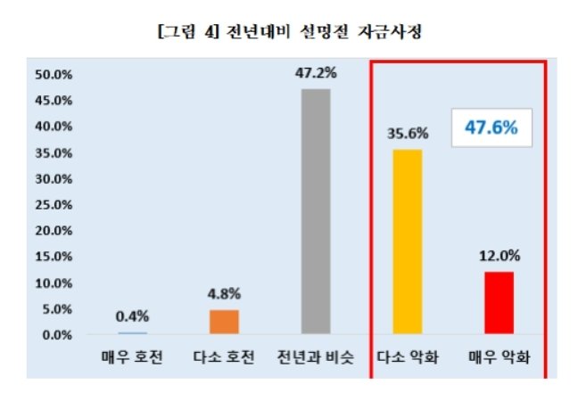 '악화했다'는 기업 중 건설업이 53.8%로 가장 많고, 제조업(47.4%), 유통·서비스업(44.5%) 순이었다.