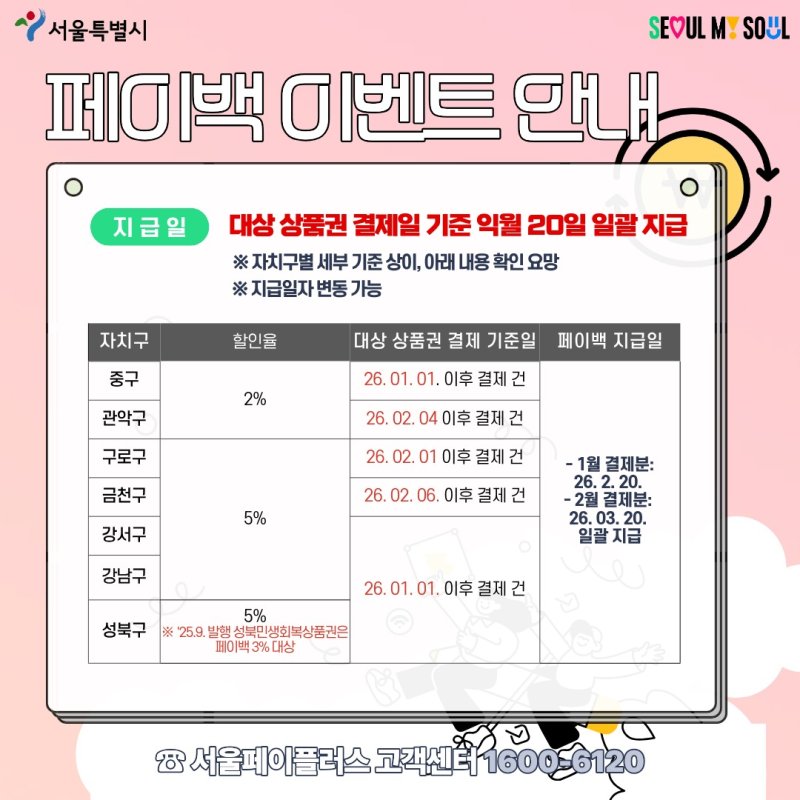 자치구 서울사랑상품권은 선할인(5%) 외에도 결제금액의 최소 2%에서 최대 5%를 상품권으로 돌려주는 페이백 이벤트를 진행한다. 7개 자치구(중구, 성북, 강서, 구로, 금천, 관악, 강남)가 시행할 예정이며 자치구별로 중구와 관악구는 결제금액의 2%, 성북·강서·구로·금천·강남은 5%를 상품권으로 돌려준다. 한편, 지난 25년 9월 7% 선할인으로 발행된 성북사랑민생상품권의 경우 3% 페이백이 적용된다.