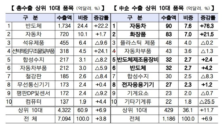 품목별로는 자동차와 화장품이 수출 성장을 견인했다.