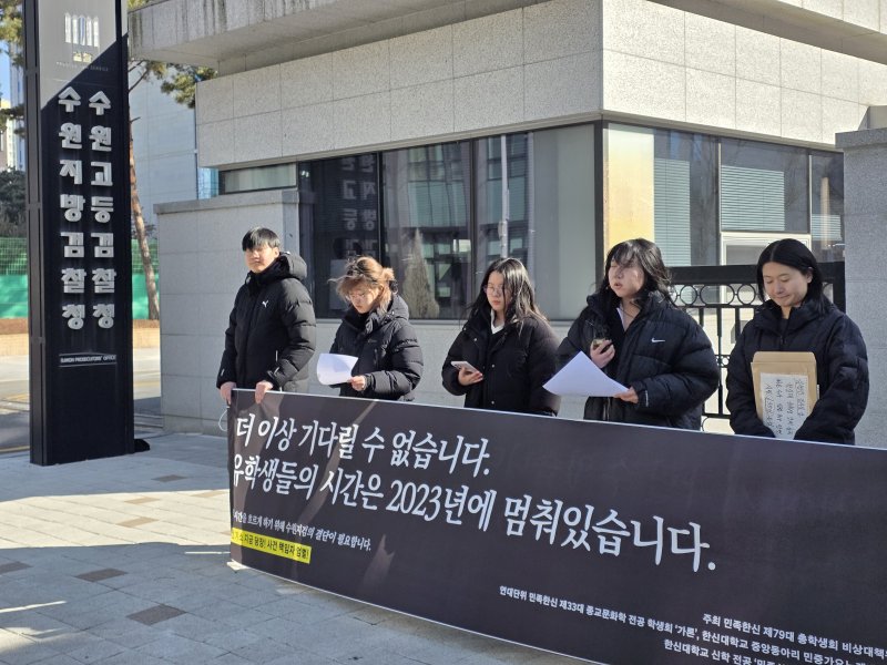 (수원=뉴스1) 배수아 기자 = 한신대 어학당 유학생 강제 출국 논란과 관련해 한신대 학생들이 검찰의 빠른 수사와 기소를 촉구했다.