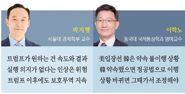박 교수도 이 교수처럼 버티기 전략의 위험성을 크게 우려했다. 그는 "우리가 협정을 이행하지 않고 시간 끌기만 한다는 인상을 주면 트럼프에게 제대로 '미운털'이 박히게 된다"며 "트럼프가 작정하고 한국을 괴롭히려면 엄청나게 괴롭힐 수 있다"고 말했다. 아울러 "트럼프 이후에도 보호무역주의 흐름은 지속될 것"이라며 "단순히 트럼프 비위를 맞추는 차원이 아니라 미국 시장 내 생존을 위한 장기적 관점에서 접근해야 한다"고 제언했다.