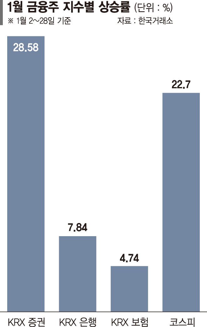 28일 한국거래소에 따르면 1월2일부터 이날까지 KRX 증권지수는 연초 대비 28.58% 상승하며 금융주 중 가장 높은 수익률을 기록했다. 같은 기간 KRX 은행지수는 7.84%, KRX 보험지수는 4.74% 오르는 데 그치며 증권주와 격차가 크게 벌어졌다.