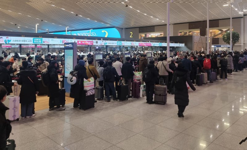 28일 업계에 따르면 아시아나항공이 T2로 이전한 이후 공항 혼잡도가 높아지며 이용에 불편을 호소하는 여객들이 늘어나고 있다. 실제 지난 26일 찾은 인천공항 T2 아시아나항공 H열 카운터에는 체크인 고객이 몰리며 G열 카운터까지 긴 줄을 서기도 했다.