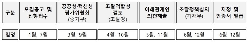 신청 제품은 공공성·기술혁신성 평가와 조달청의 조달 적합성 검토, 재정경제부 주관의 조달정책심의위원회를 거쳐 6월 최종 지정한다.