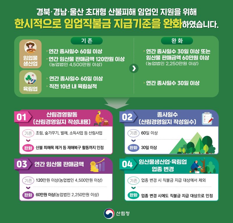 이상익 산림청 산림산업정책국장은 “산불로 생활 터전을 잃은 임업인들이 한시적 제도 완화를 통해 안정적으로 산림경영에 복귀할 수 있도록 적극적으로 지원할 계획”이라고 밝혔다.