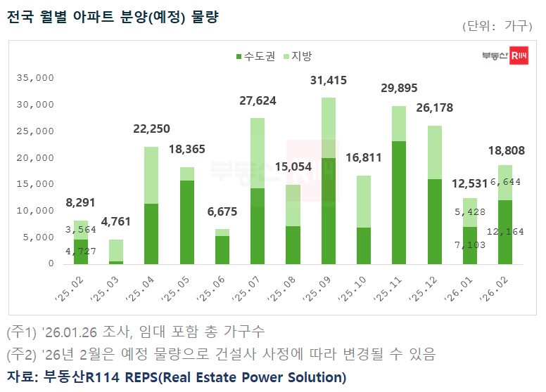 물량 증가 배경에는 대단지 위주로 공급이 확대된 것이 영향을 끼친 것으로 보인다. 부동산R114는 "수도권에서는 정비사업 일반분양 단지가 관심을 끌 것으로 보이고, 지방은 입지와 상품성이 검증된 핵심지 위주로 청약통장이 몰릴 전망"이라며 "다만 설 명절 전후로 공급 일정을 조율하는 단지가 늘 수 있어 계획 물량이 유동적일 수 있다"고 말했다.