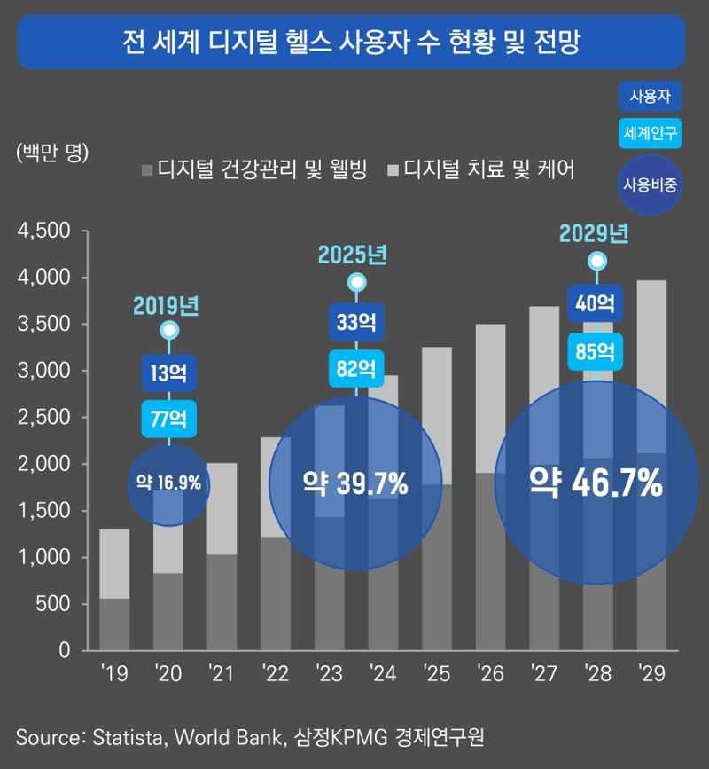 29일 삼정KPMG가 정보통신산업진흥원(NIPA)과 함께 29일 발간한 ‘K-디지털 헬스케어 대전환 대응을 위한 현황 점검’ 보고서에 따르면 글로벌 디지털 헬스케어 서비스 이용률은 지난 2019년 16.9%에서 오는 2029년 46.7%까지 확대될 것으로 전망됐다. 급격한 산업 성장 속에서 산업 경쟁력 강화를 위한 새로운 한국 디지털 헬스케어 성장 전략 마련이 필요하다는 분석이 나왔다.