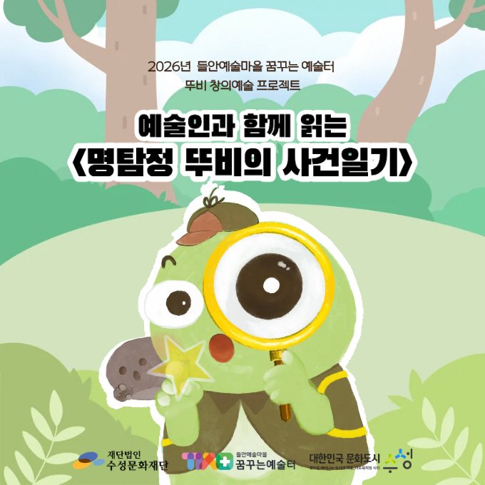 프로젝트는 수성구 문화도시 조성사업의 하나로 1월18일부터 3월14일까지 경북권 유일의 문화예술 전용 공간인 '꿈꾸는예술터 두산동'에서 진행된다. 지역 예술인과의 협업을 통해 수성구 대표 캐릭터 뚜비를 활용한 창작 콘텐츠를 개발·운영하고 주민 참여형 프로그램을 통해 문화 향유 기회를 확대하기 위해 마련됐다.