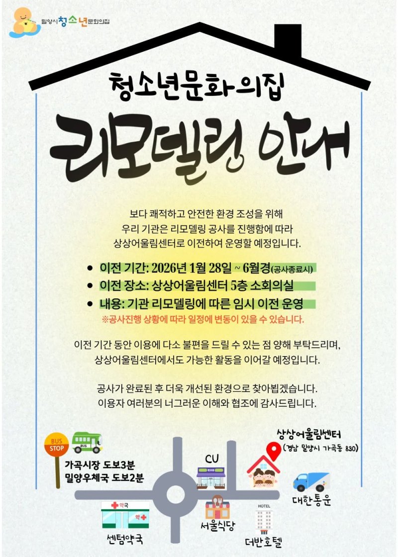 앞서 청소년문화의집은 지난 28일부터 가곡동 상상어울림센터로 임시 이전해 운영을 시작했다.