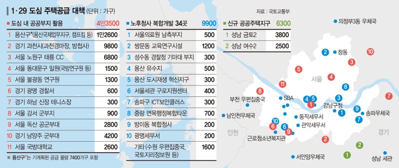 이 밖에도 △용산 유수지(500가구)·도시재생 혁신지구(300가구) △서울세관 구로지원센터(400가구) △송파구 ICT보안클러스터(300가구) △중랑구 면목행정복합타운(700가구) △방이동 복합청사(200가구) △광명세무서(200가구) △성남세관(100가구) △국토지리정보원(200가구) △기타 400가구 등이 복합개발 대상지로 포함됐다.