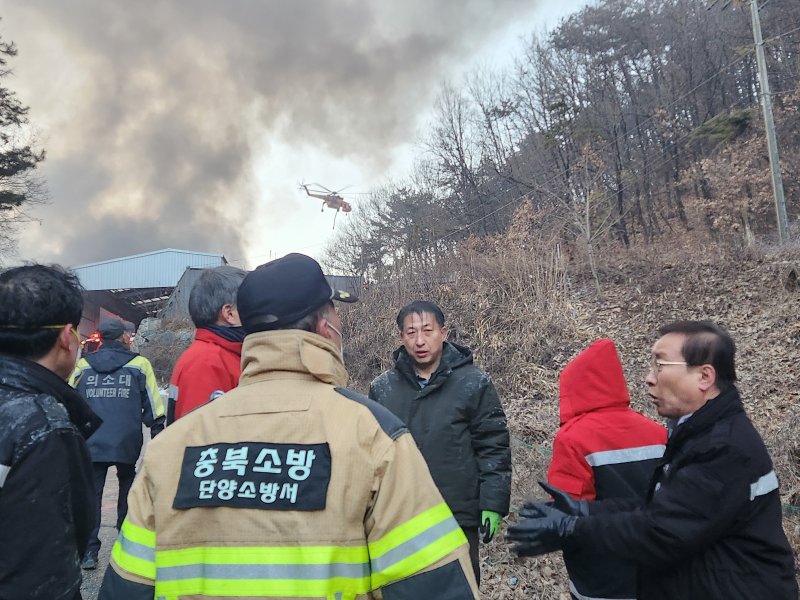 같은 날 오후 4시 16분쯤 충북 단양군 매포읍의 한 폐기물 업체에서 불이 나, 인근 야산으로 번지고 있다.