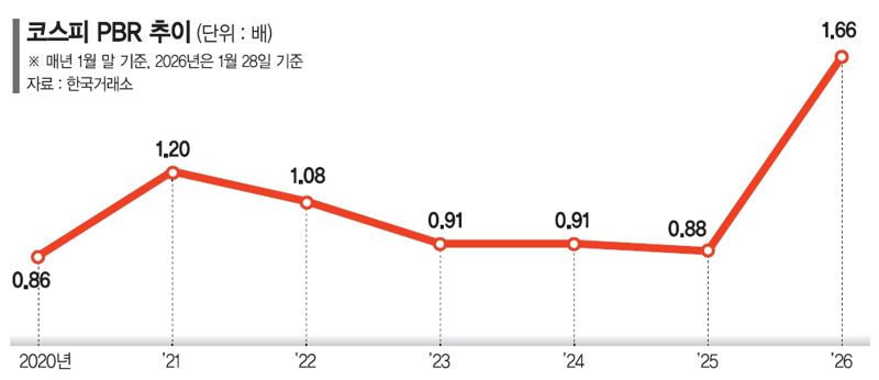 29일 한국거래소에 따르면 전날 기준 코스피 PBR은 1.66배로, 지난해 1월 말 0.88배에서 두 배 수준으로 상승했다. 같은 기간 코스닥 PBR은 1.64배에서 2.60배로 올랐다. PBR은 자기자본 가치 대비 주가가 어느 수준에서 평가받고 있는지 보여주는 지표다.