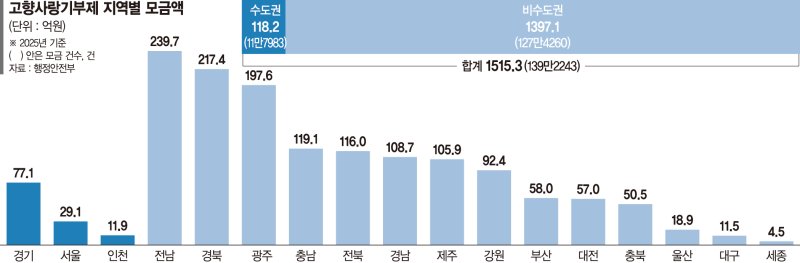 비수도권의 평균 모금액은 수도권 대비 2023년 3.3배에서 2025년 4.7배로 격차가 확대되는 추세다. 인구감소지역의 평균 모금액도 같은 기간 비감소지역 대비 약 1.7배 수준을 유지한 것으로 나타났다. 지역별 주민 수를 기준으로 모금액 규모를 분석한 결과, 비수도권의 1인당 평균 모금액은 5165원으로 수도권(432원)의 약 12배에 달했다.
