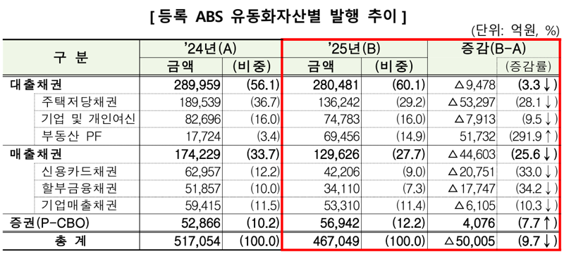 한편 2025년 말 기준 등록 ABS 전체 발행잔액은 244조5000억원으로 전년 말(257조6000억원) 대비 13조1000억원(5.1%) 감소했다.