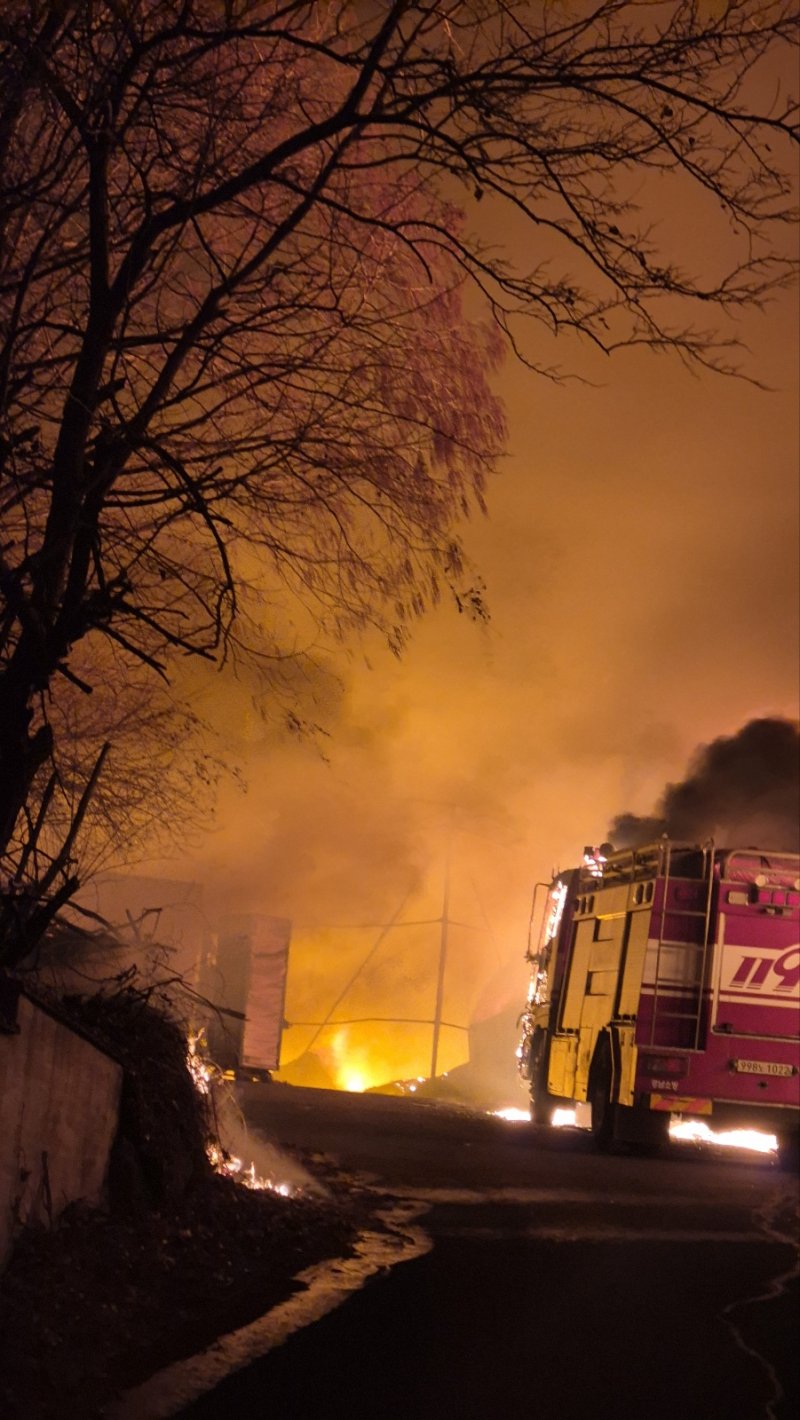 [김해=뉴시스] 김상우 기자 = 29일 오후 6시 52분께 경남 김해시 생림면 비철금속제조 공장에 불이났다.