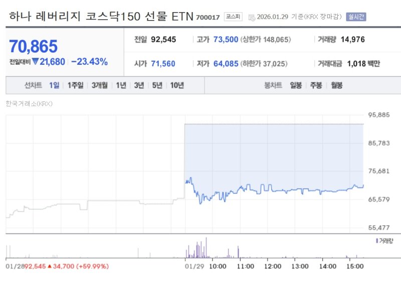 30일 하나증권이 발행한 '하나 레버리지 코스닥150 선물 ETN'은 28일 상한가로 마감한데 이어 29일은 23.43% 하락 마감했다. 코스닥 150지수 수익률을 두 배로 추종하는 상품이지만 지수 움직임을 전혀 쫓아가지 못하는 모습이다.