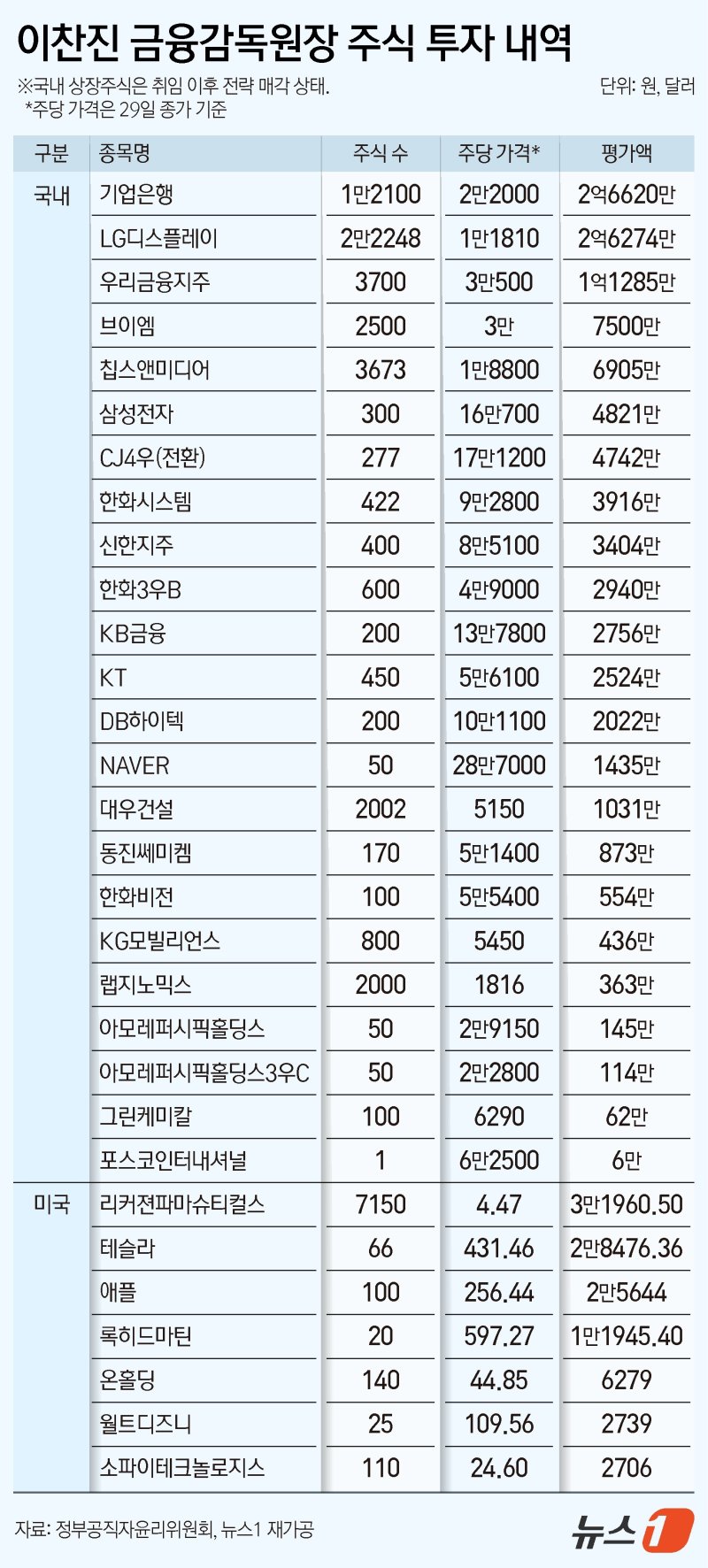 단일 종목 기준 최대 투자 대상은 IBK기업은행이다. 이 원장은 기업은행 1만 2100주를 보유하고 있으며, 주당 2만 2000원(29일 종가 기준)으로 환산하면 약 2억 6620만 원 규모다.