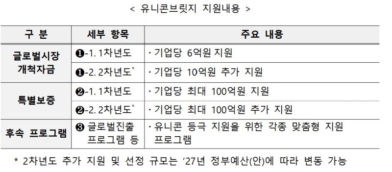 유니콘브릿지 사업은 단기간에 유니콘으로 성장할 수 있는 유망 기업을 발굴하고 2년간 총 16억원의 정부지원금과 최대 200억원의 특별보증을 제공하는 프로그램이다. 유니콘 육성이라는 국정과제를 달성하기 위해 올해 처음 실시된다. 1차년도, 2차년도, 후속프로그램으로 나눠 지원한다.