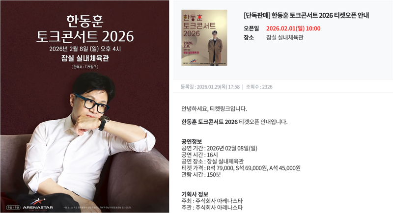 한 전 대표는 오는 2월 8일 잠실체육관에서 '한동훈 토크콘서트 2026'을 개최한다. 티켓 판매는 예매 플랫폼 티켓링크에서 2월 1일부터 시작된다. 예약사이트 정보를 보면 콘서트는 오후 4시에 시작해 150분간 진행된다. 좌석은 R석이 7만9000원이고 S석과 A석은 각각 6만9000원, 4만5000원이다.