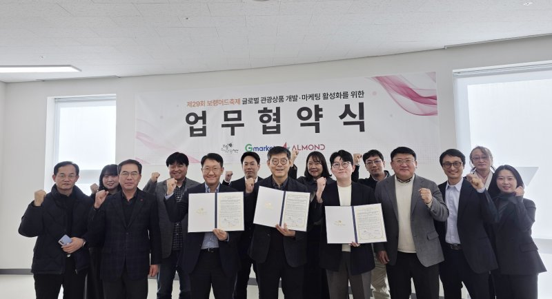 [보령=뉴시스]유순상 기자 = 보령축제관광재단은 보령머드테마파크에서 올해 제29회 보령머드축제 글로벌 경쟁력 강화 및 해외 관광객 유치 확대를 위해 '아몬드', '지마켓'과 협력 업무협약(MOU)을 체결했다고 30일 밝혔다.