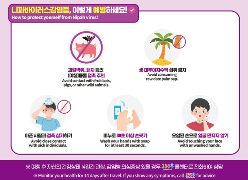 임승관 질병청장은 "니파바이러스 감염증을 제1급 감염병으로 지정해 철저히 대비하고 있으며 인도 외 국가들에서는 추가 발생이 없으나 감염 시 치명률이 높아 감염 위험에 노출되지 않도록 조심해야 한다"고 말했다.
