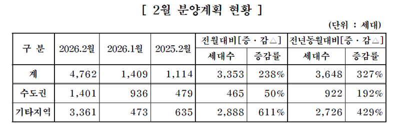 30일 대한주택건설협회가 회원사를 대상으로 집계한 결과, 오는 2월 8개사가 7개 사업장에서 4762가구를 공급하는 것으로 파악됐다. 1월(1409가구) 대비 약 2.4배(3252가구) 늘었으며, 지난해 2월(1114가구)과 비교하면 3.3배(3648가구) 증가한 수치다.