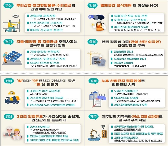 지방정부들은 안전관리자 선임이 어려운 작은 사업장들을 위한 공동안전관리자 지원, 어선작업현장·농축산업 등 기존 지원사업들이 닿기 어려웠던 일터 지원, 뿌리산업·조선업 등 지역의 사고 다발 업종 집중지원, 외국인노동자 등 안전 취약계층에 대한 지원을 중심으로 특화사업을 기획했다.