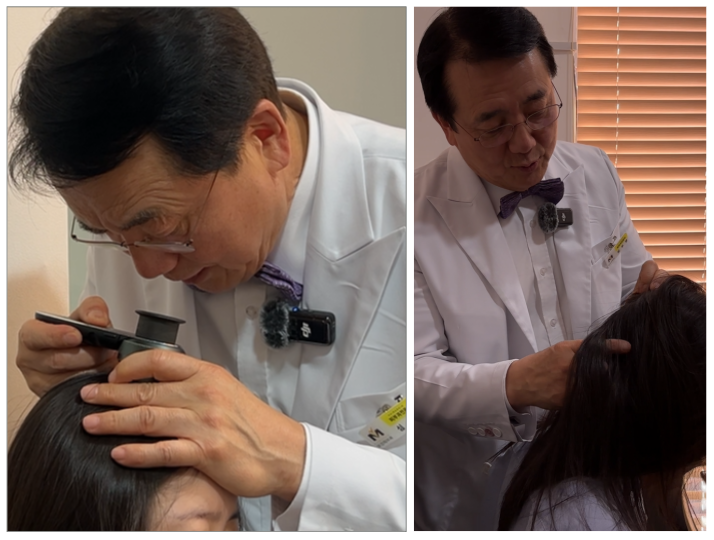 “후두부 보세요. 모발이 아주 빽빽하고 굵죠? 정수리에는 가느다란 모발이 많이 보입니다.”