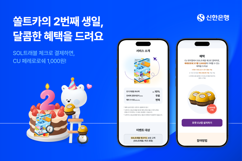 [파이낸셜뉴스] 신한은행은 SOL트래블 체크카드 출시 2주년을 맞아 내달 1일부터 13일까지 CU편의점과 고객 감사 이벤트를 진행한다고 30일 밝혔다.