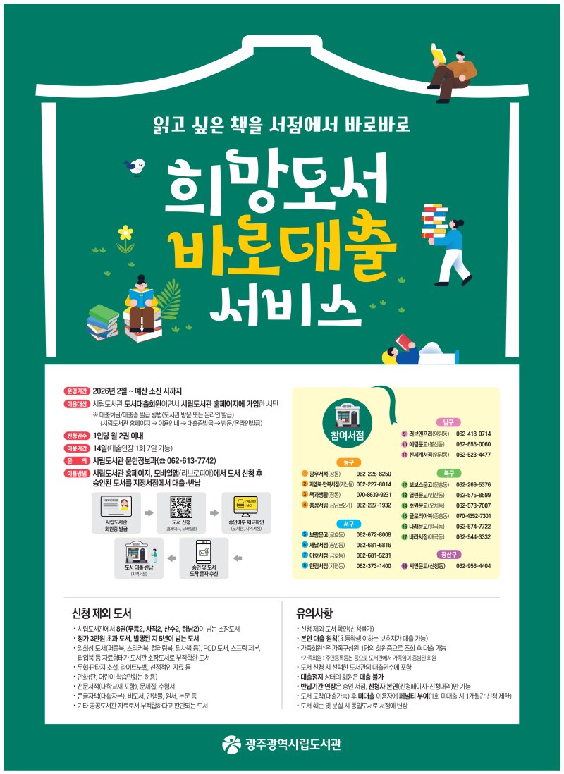 광주시립도서관은 지역서점을 활성화하기 위한 '희망도서 바로대출 서비스'를 오는 3일부터 시행한다고 1일 밝혔다.