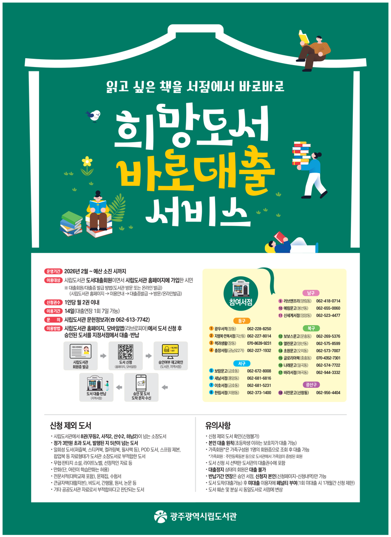 올해는 △동구 4곳(광우서적, 지엠북, 책과생활, 충장서림) △서구 4곳(보람문고, 새날서점, 이호서점, 한림서적) △남구 3곳(러브앤프리, 예림문고, 신세계서점) △북구 6곳(보보스문고, 열린문고, 초원문고, 글로리아북, 나래문고, 바라서점) △광산구 1곳(시민문고) 등 총 18개 서점과 협업해 서비스를 제공한다.