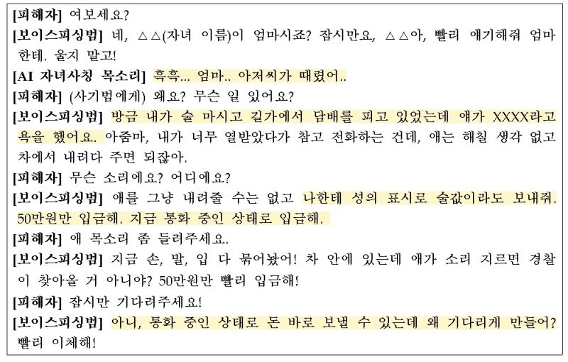 이때 자녀의 울음소리는 AI로 조작한 가짜 목소리로, 부모의 불안심리를 자극해 상황 판단 능력을 흐리게 만든다.